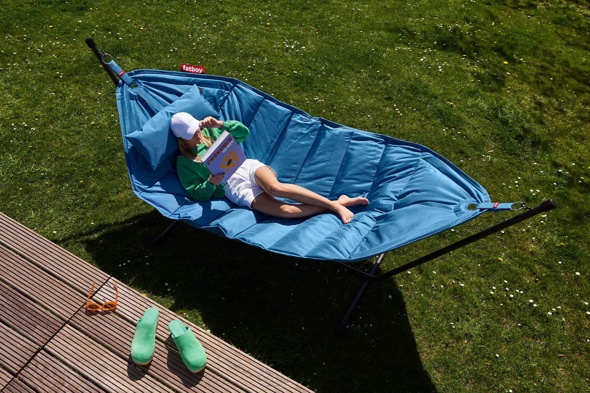 You don't have to be a handyman or royalty to enjoy Headdemock hammock life. Assemble the posts of the frame, roll out the hammock and hang it on the hooks. That’s it! All you have to do now is set the ideal hammock height with the straps and lie down. When it comes to this hammock, Fatboy has thought of everything. The Headdemock Cover is a tailor-made raincoat for your luxury hammock that protects it from moisture and dirt. And, with a Headdemock Pillow, you’ll be even more comfortable. Need some new parts after years and years of hanging out in your Headdemock? It’s a snap to reorder extra straps, caps or rings.